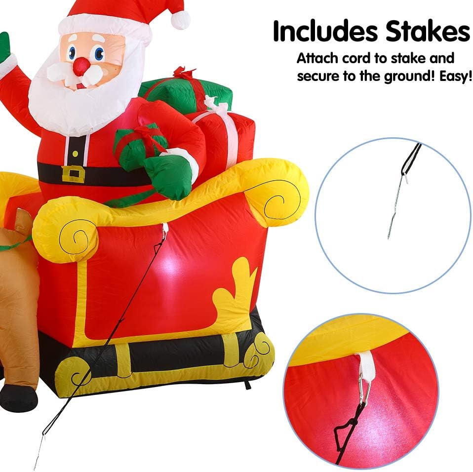 This santa claus on sleigh with three reindeer christmas inflatable is great for decor in and out of the home.